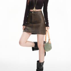 2025 Herbst Winter Damen Maillard Brown A-Linie Leder rock mit hoher Taille und Schlitz Denim Vintage Cheeky Mini Hugging Fit